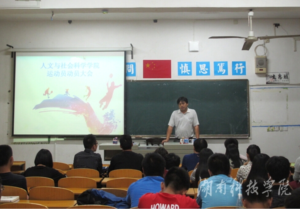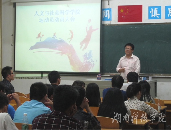 本网讯(通讯员 袁玲玲 覃雅君)为鼓舞运动员们以饱满的精神、昂扬的斗志迎接即将到来的第十届田径运动会,10月19日,人文与社会科学学院在明德楼举行动员大会。该院党总支副书记邓先军,学工办主任夏汉伟、副主任欧阳素勤、运动员指导员肖付明,以及全体运动员与会。