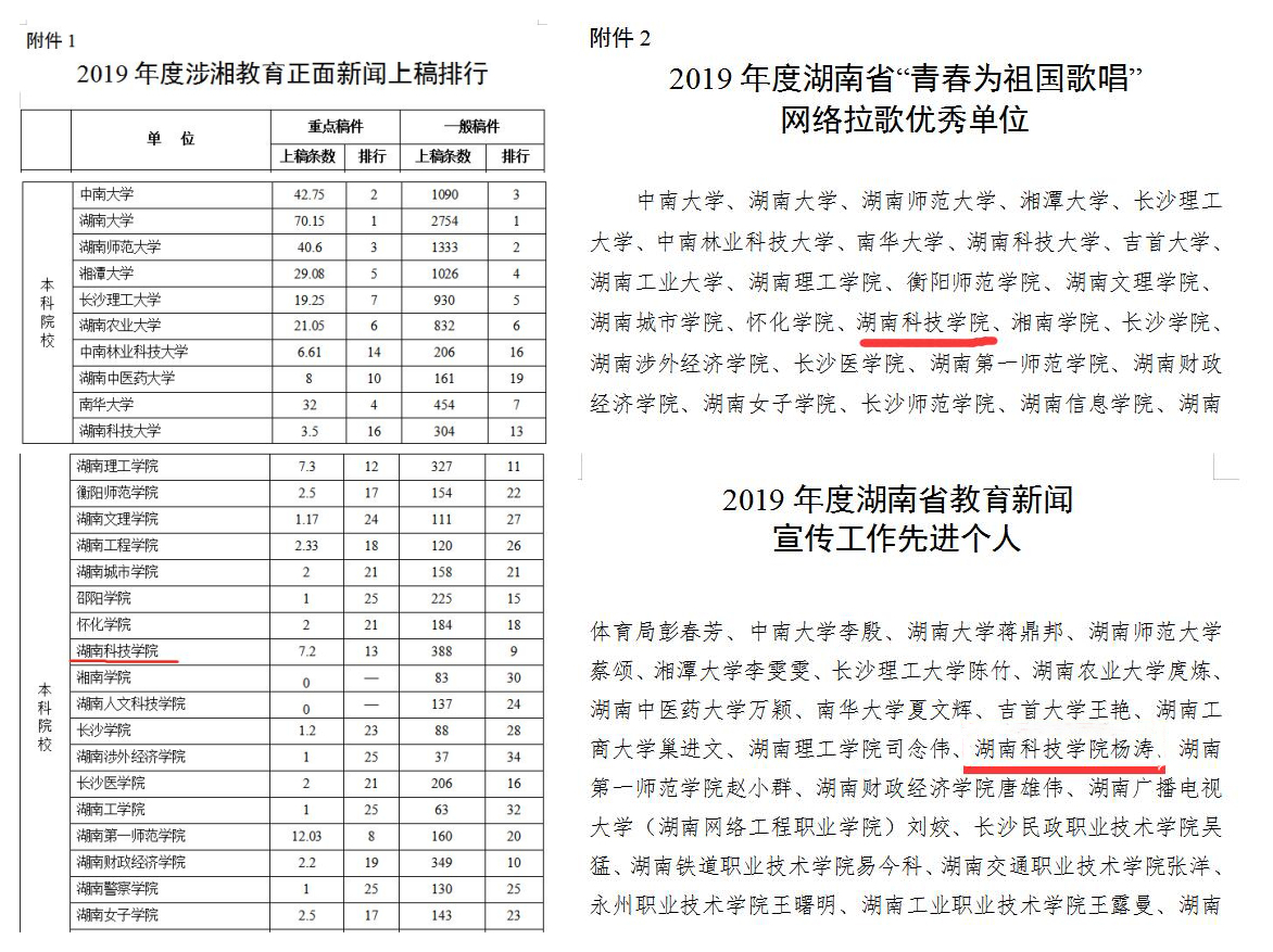 本网讯  近日湖南省教育厅下发的《关于2019年度全省教育新闻宣传工作情况的通报》(湘教通【2020】82号)中获悉,我校2019年度涉湘教育正面新闻重点稿件上稿7.2篇,一般稿件上稿388篇,重点稿件和一般稿件在全省同类院校中均位列第一学校获得2019年度湖南省“青春为祖国歌唱”网络拉歌优秀单位,杨涛同志荣获2019年度湖南省教育新闻宣传工作先进个人。