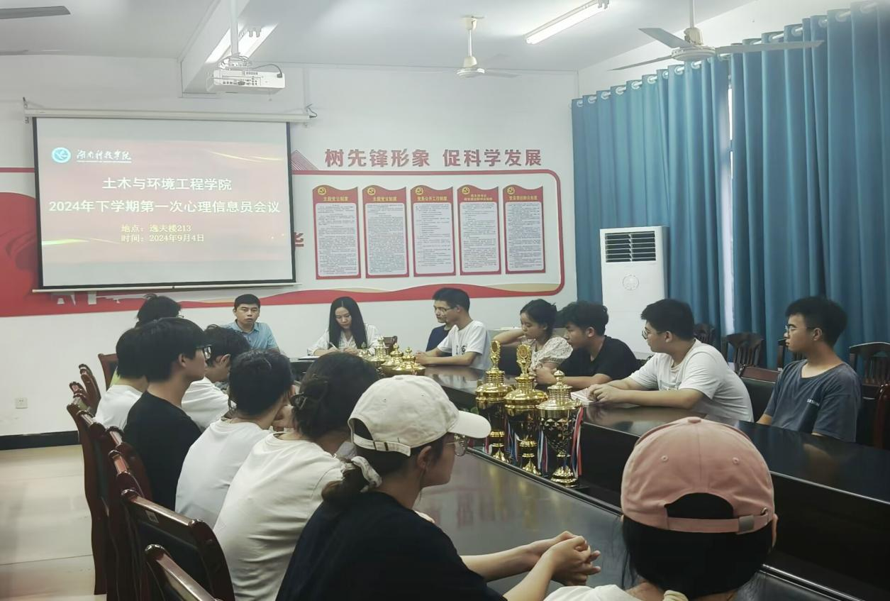 本网讯(通讯员:潘艳丽 孟新宇)9月4日,土木与环境工程学院在逸夫楼213召开了2024年下学期第一次心理信息员会议,会议由心理专干潘艳丽主持,党总支副书记任学兵、各班心理委员、信息员参加。