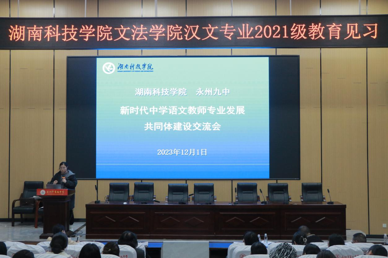 本网讯(通讯员:李惊宇 梁怡)为增强汉语言文学专业学生对专业技能的掌握,深化专业理论知识的理解,实现知识向实践的转化,提升教育教学能力,12月1日,在学院实习研究队宋艳旭老师和各班领队老师及辅导员龙慧老师的带领下,2021级汉语言文学专业学生前往永州市第九中学开展教育见习活动。出席本次会议的有文法学院院长谷显明教授,副院长肖智成博士,万搏平台语文教育研究中心主任刘忠华老师,中文系副主任尹华君老师以及永州市九中教师团队和21级全体汉文专业学生。