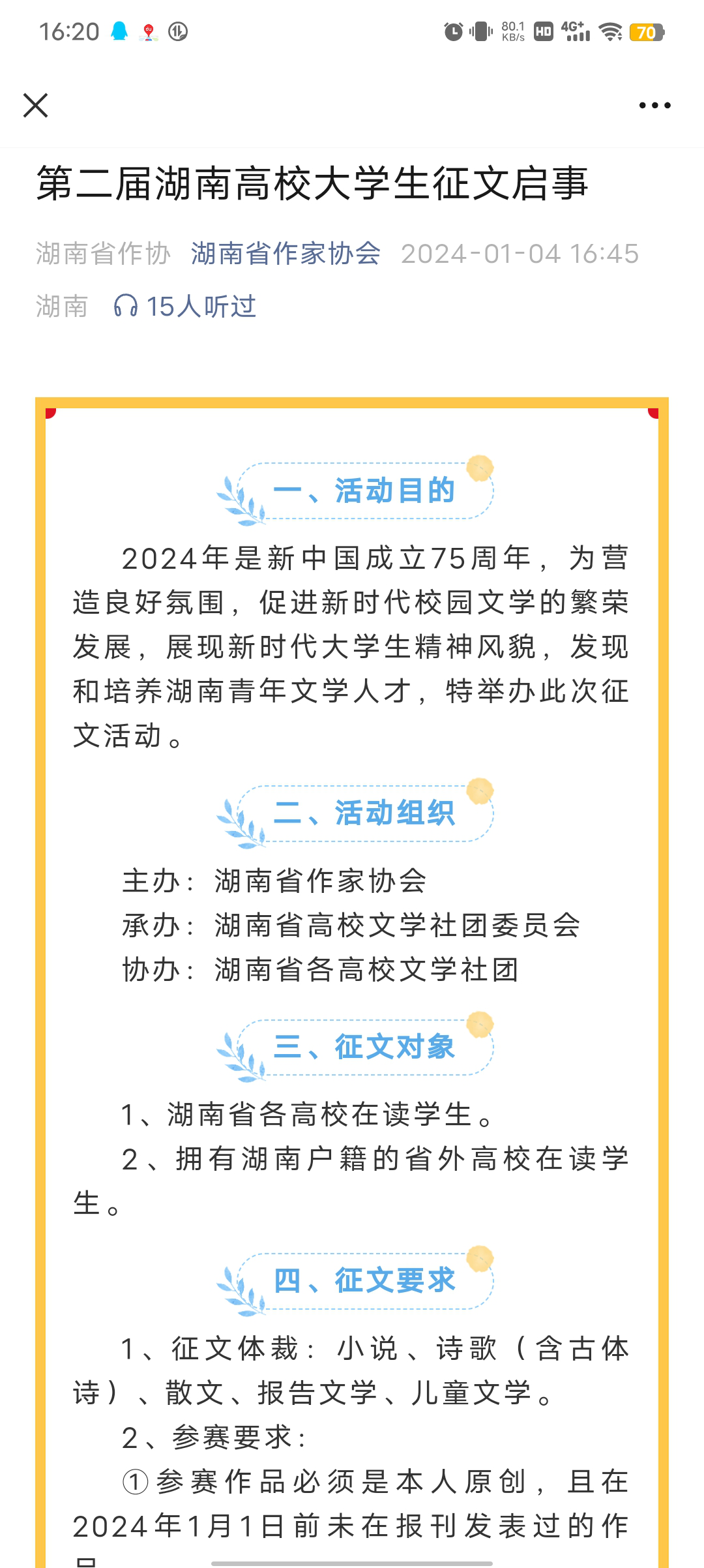 文学如灯,亘古长明。自1979年成立以来,西山文学社始终秉承“繁荣校园文化,培养文学新人”的理念,积极的地开展各项活动,在学校内外都产生了积极的影响。校内,我们开展了“蓝信封”活动和“写给2024”等活动,让文学给予我们感动和力量。校外,我们积极承办湖南省大学生征文活动,与湖南其他高校文学社紧密联系,交流合作。