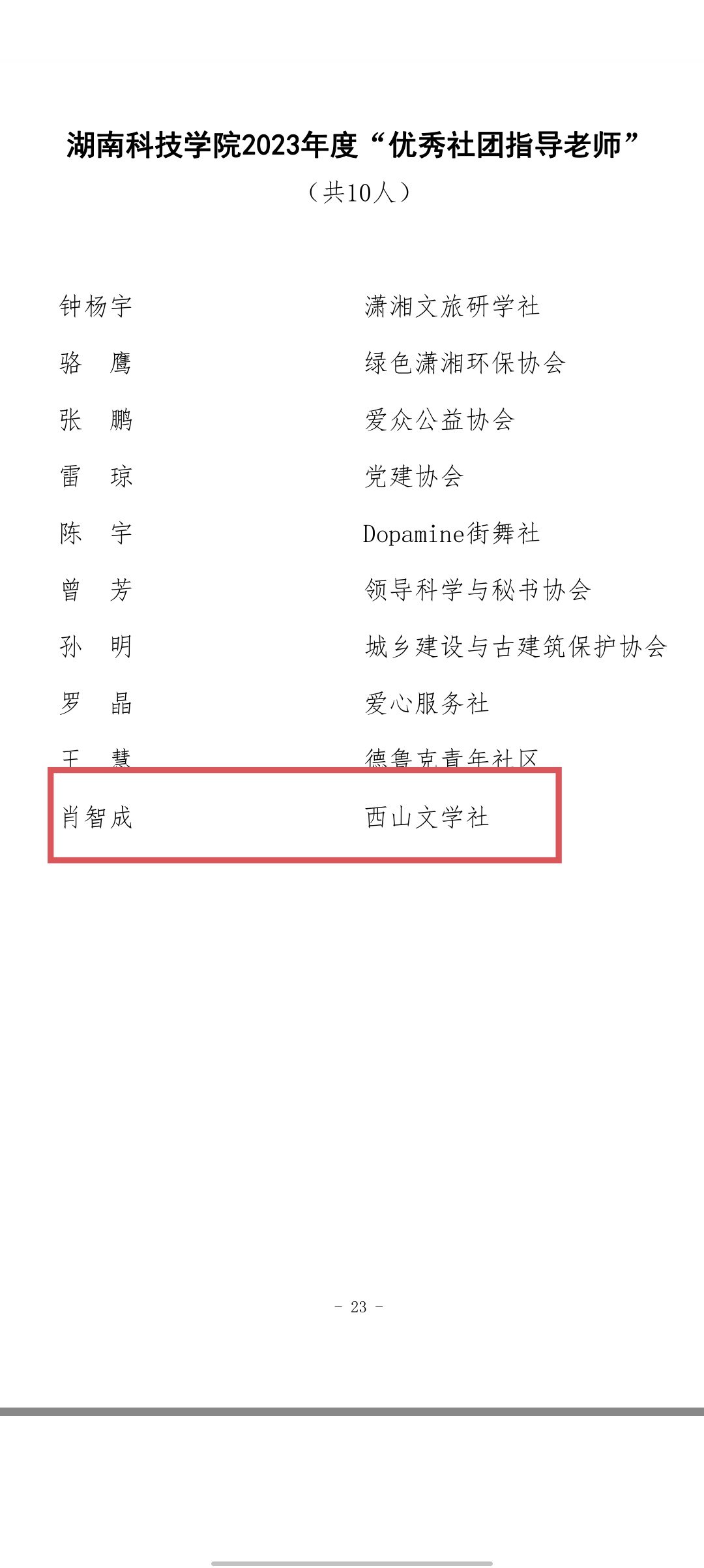 本网讯(通讯员 唐文倩)4月29日下午,万搏平台2023年度五四表彰大会在潇湘大讲堂举行。万搏平台党委书记李钢、党委委员副校长何福林等领导出席活动,并为获奖团体和个人颁奖。其中,西山文学社荣膺“十佳社团”荣誉称号,指导老师肖智成荣获“优秀指导老师”称号。