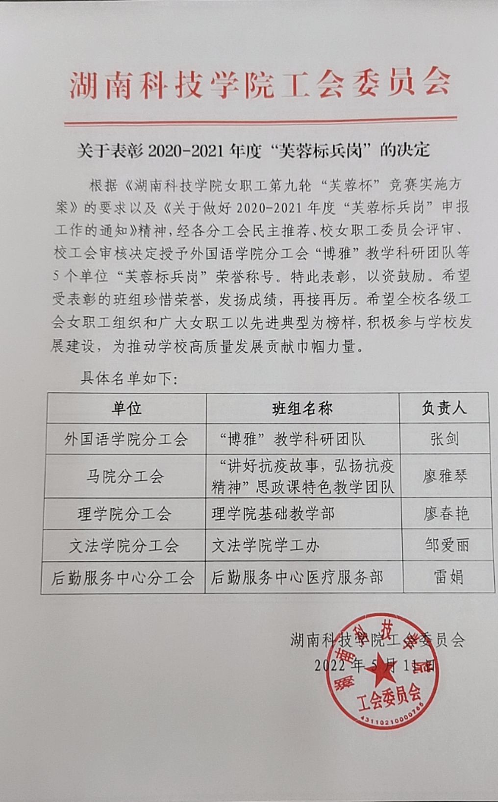 万搏平台关于表彰2020-2021年度“芙蓉标兵岗”的决定