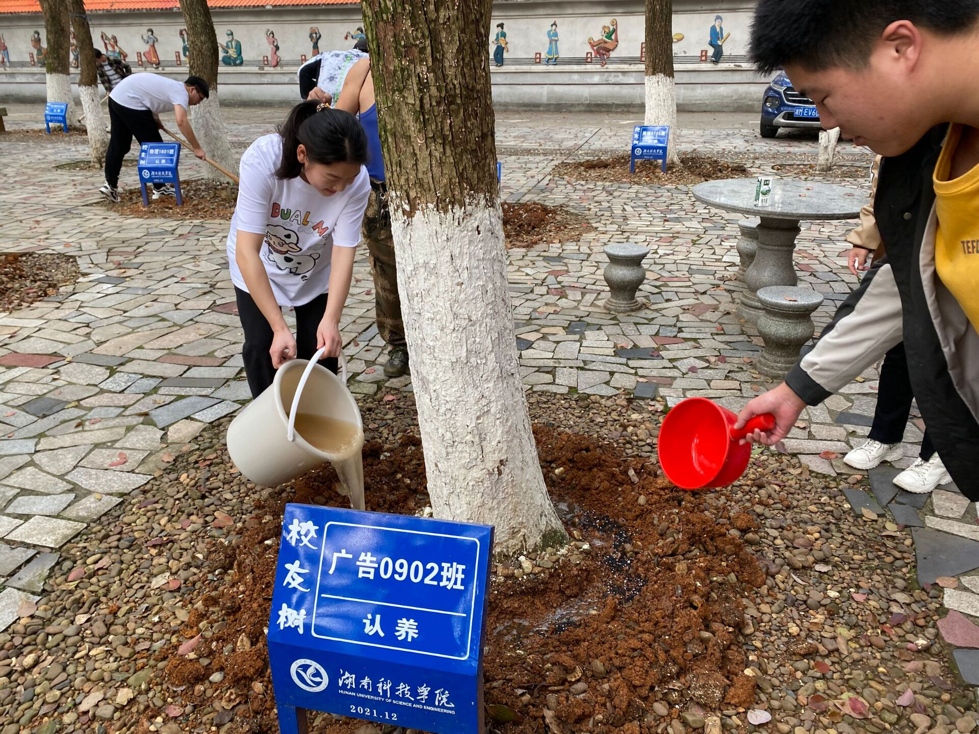 活动开始前,志愿者们在博雅楼门前签到并集合拍照,随后工作人员给志愿者们分发劳动所需的的工具。在此之前,后勤的工作人员还给志愿者们示范如何操作并讲述了一些关于植树的知识。活动开始后,志愿者们按照工作人员的安排,到指定的地点进行对树木的浇水与施肥,一切都在井然有序的进行着。在晨读区的樟树全部浇水施肥后,工作人员组织志愿者们合影留念,并宣布本次活动圆满结束。