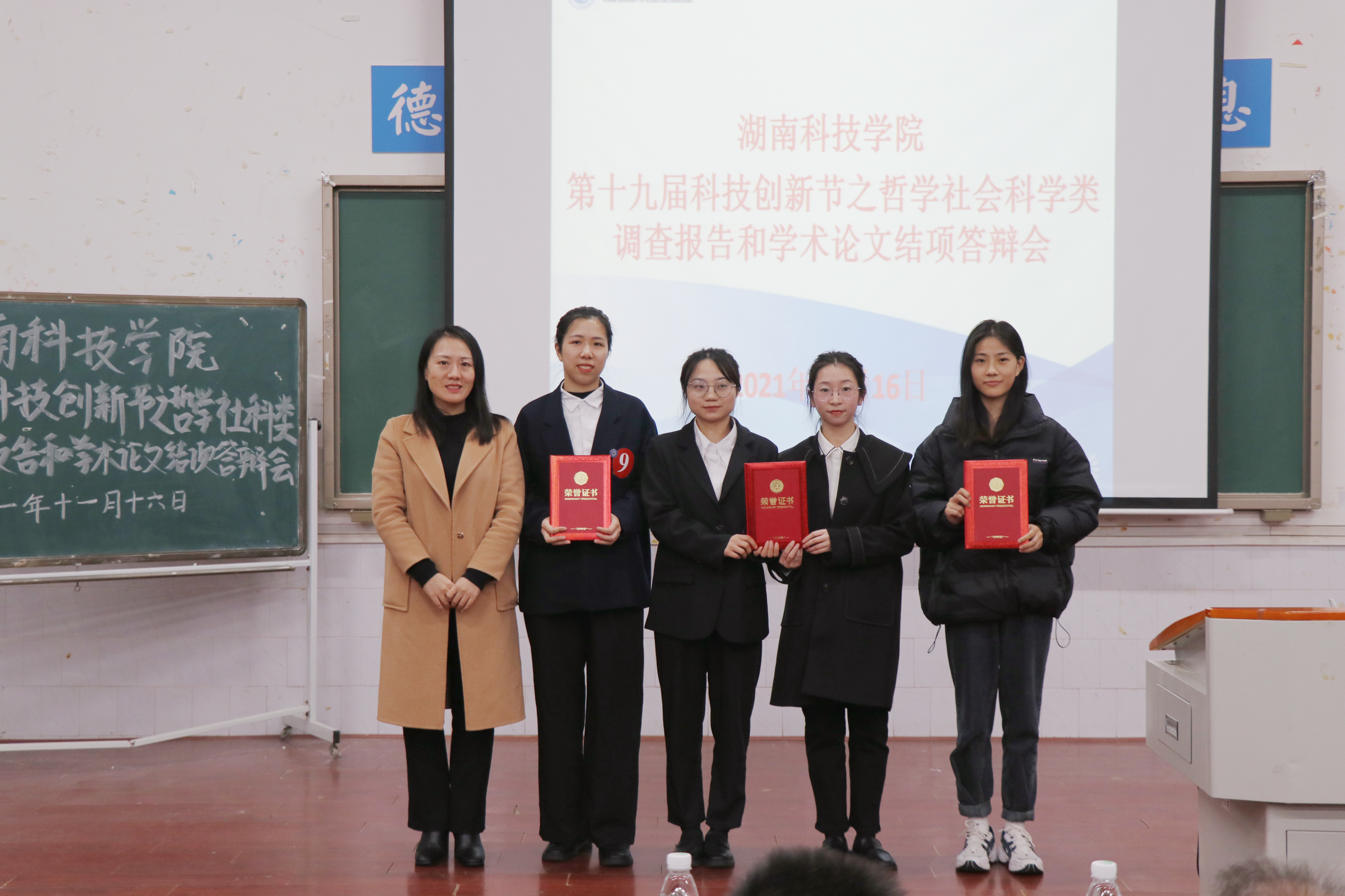 最终张静怡小组《虚拟现实技术融入党史教育教学路径研究》荣获一等奖;冯慧慧小组《“红军长征过永州”革命遗址调查与数字化保护研究》和肖佳雨小组《基于FIF口语训练系统的英语专业学生英语口语学习现状调查及学习策略研究》荣获二等奖;吴曼小组《万搏平台大学生志愿服务调查与研究》、王梅香小组《空间与史脉:大湘南红色旅游资源开发策略研究》和戴宏展小组《产业转移对区域经济增长、城乡发展差距的影响分析——基于湖南省1988年至2018年的数据实证》荣获三等奖;黄莉小组《直播经济助力乡村振兴研究——以安化黑茶为例》、周杰小组《红色文旅融合助推湘赣边革命老区乡村振兴》和李梦然小组《党史学习媒介使用与价值认同的调查研究——以永州地方高校为例》荣获优胜奖。