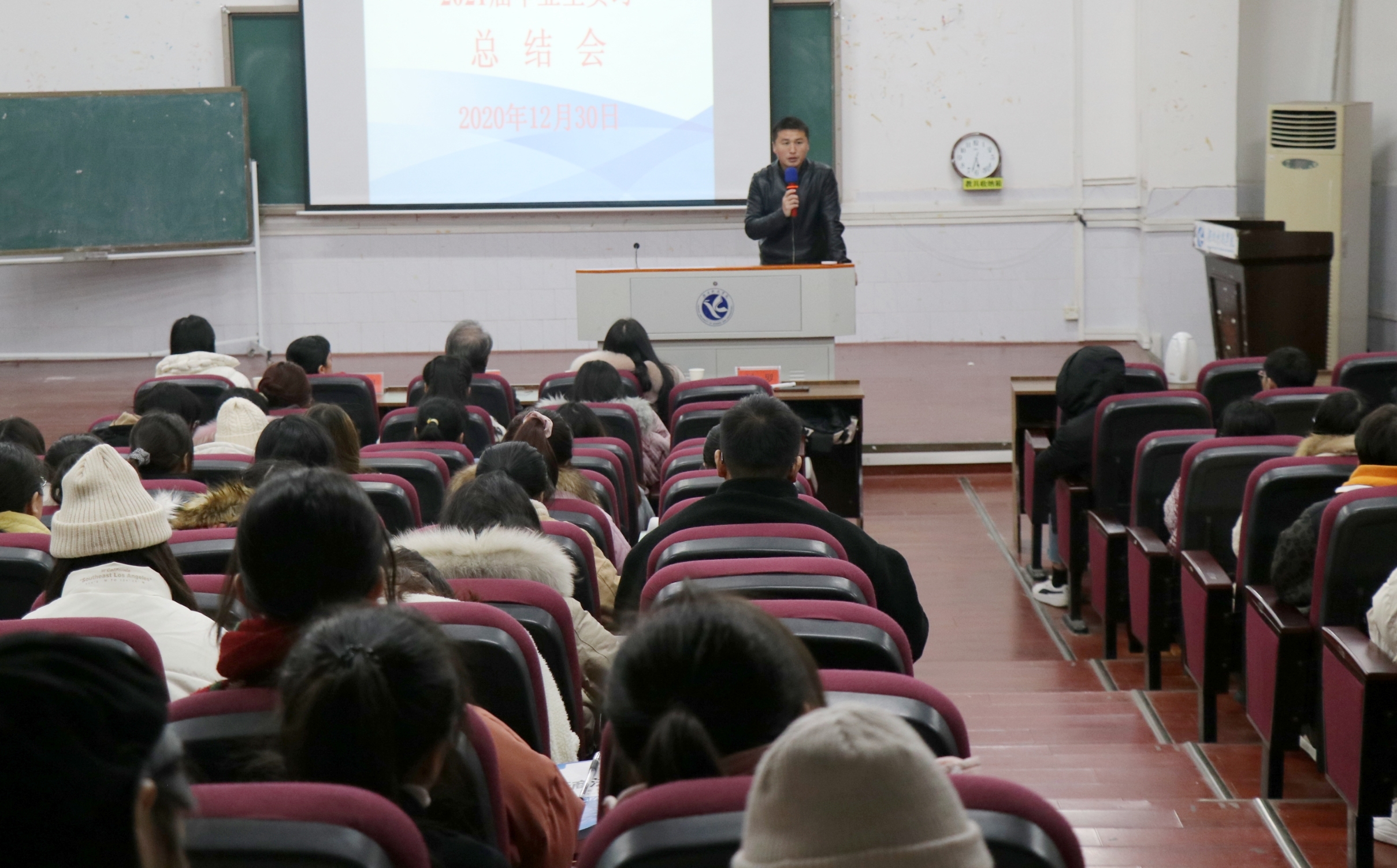 本网讯(通讯员 文慧聪)12月30日晚7:30,外国语学院在博雅楼东三教室召开了商务英语专业2021届毕业生实习总结会。外国语学院院长欧华恩、商务英语系系主任李靓、2021届实习带队老师唐晨、潘缌缌及商务英语专业17级、18级全体学生参加此次会议。会议由17级辅导员、学工办副主任刘罗主持。