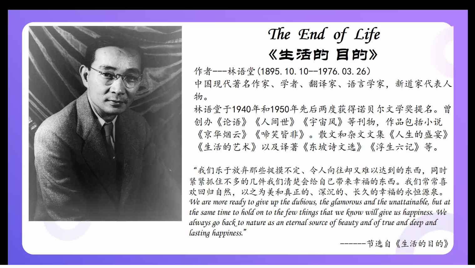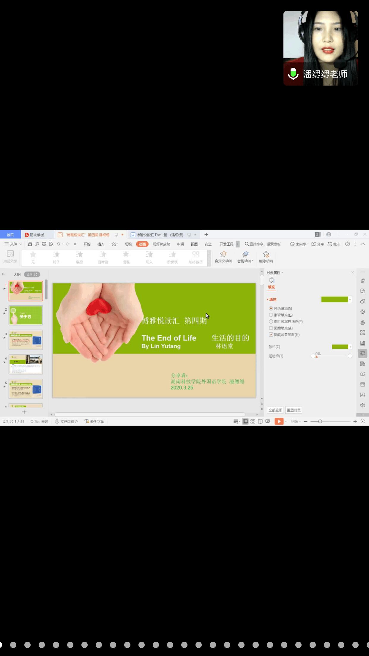 本次悦读汇邀请到的分享嘉宾是外国语学院专任教师潘缌缌,她曾荣获万搏平台实验实训教学比赛一等奖、万搏平台研讨式课堂比赛一等奖,她所分享的文章是林语堂的《The End of Love 生活的目的》。活动伊始,同学们以连麦的方式朗读了文章中自己喜欢的文段,并在评论区分享了自己在阅读过程中的所感所想。接着,潘缌缌老师为同学们介绍了文章写作的历史背景以及具体内容,以评论区互动的方式与同学们谈论了“生活的目的是什么”等系列话题。在倾听了同学们的朗读和感悟后,潘缌缌老师分享到:“从今天起,努力去做一个可爱的人,不羡慕谁,也不放弃目标,保持一颗萌萌哒的心,努力坚持进步。成长路上只有自己责无旁贷,所以你除了努力别无选择。真正重要的不是生命里的岁月,而是岁月里的生活。愿你们都能成为一个可爱的人”。