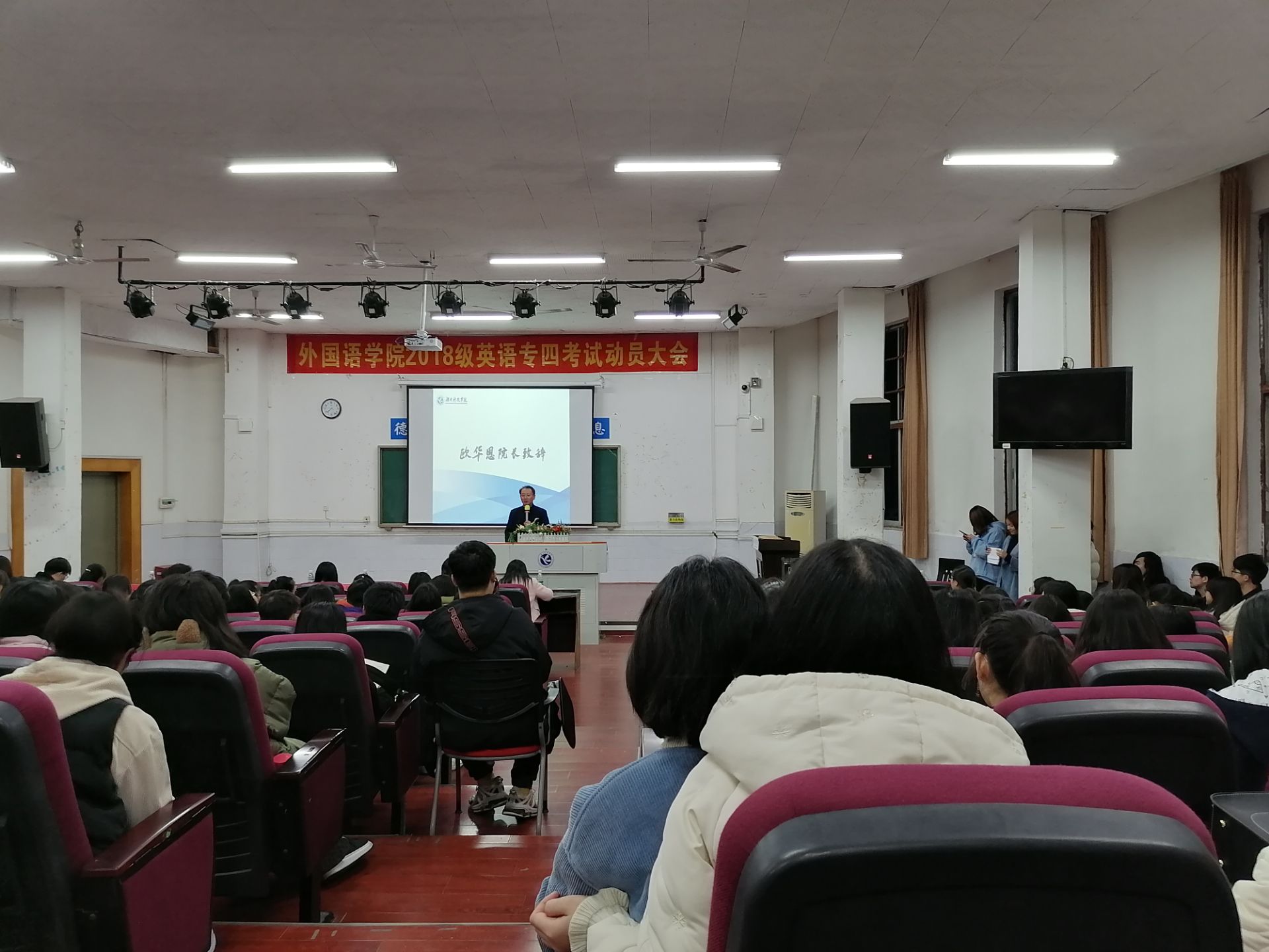 本网讯(通讯员 袁林林)为使大二英语专业学生更好地应对专四考试,外国语学院特于12月3日晚上七点半在博雅楼东三举办此次“英语专四动员大会”,莅临此次大会的领导有外国语学院院长欧华恩、党总支书记雷树彬、副院长彭宁红、副院长何丽萍、副院长胡维、党总支副书记罗晶及专业任课老师郭旭明、谭浩亮、廖海燕、潘缌缌、黄银、张瑞林、陈建勇、唐晨及18级辅导员王素芳,参会人员为2018级全体英语专业生。