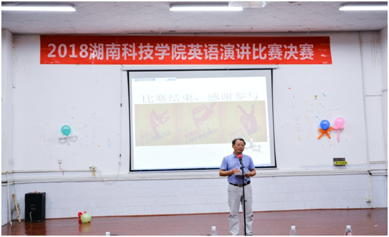 比赛最后,欧院长上台对选手们的表现进行了精彩点评,提出了表扬,也指出了许多不足,他表示同学们的英语学习之路、英语演讲之路依旧漫长,还需加倍努力。