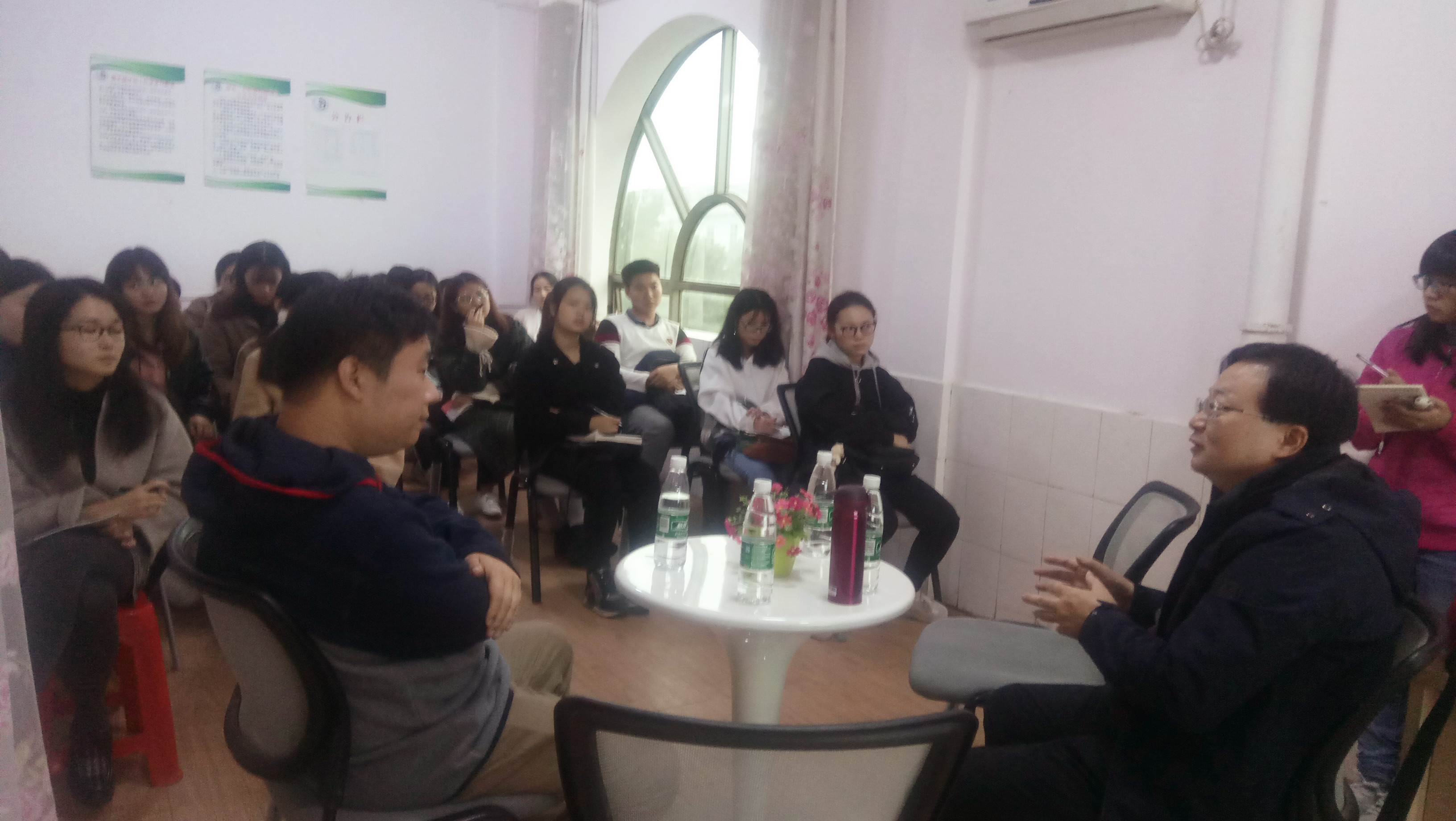 石永生简要的介绍了深圳地区老师报名时间、招聘的方式以及备考资料等信息。对于招聘的形式,石永生教授进行了详细的讲解。招聘的内容主要由面试和笔试组成,其中面试主要就一些特殊情景进行提问,但大部分还是以模拟讲课的形式为主;笔试则主要围绕教育学、心理学等进行出题,题型多为选择题、填空题和辩论题。石永生还与同学们就深圳大学研究生报考、教师面试礼仪、大学期间素质提升等话题进行了热烈的讨论,并给同学们提出了一些有效的建议:一、在招聘或工作中不要太张扬个性,要懂得谦卑有礼;二、要在平时生活中提升自己的实力,努力做好学好;三、注意细节,如在平时的生活中要多加练习写字等。