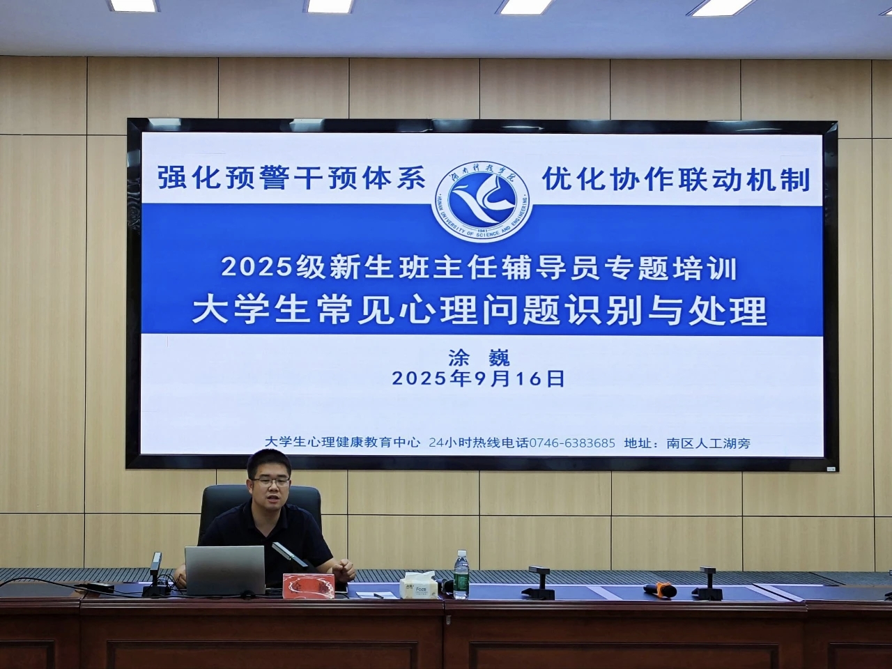 本网迅(通讯员:邓玉 罗淑雅 李海洪)为进一步强化新生班级服务与管理,提高新生适应力,按照2025级新生迎新工作整体部署,9月16日19:30-21:00,学工部在明德楼100报告厅举行2025级新生班主任、辅导员培训。本次培训由学工部副部长王君主持。主讲专家雷腾、涂巍、赵江南,以及各学院新生班主任、辅导员参加了此次培训。