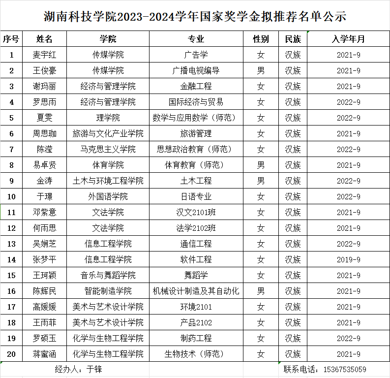 根据湖南省教育厅等5部门关于印发《湖南省学生资助资金管理办法》的通知(湘财教〔2022〕13号)、湖南省学生资助管理中心《关于做好2024年普通高校国家奖助学金评审工作的通知》(湘学助〔2024〕30号)文件要求和《万搏平台学生奖励办法》、《万搏平台学生资助管理办法》、《万搏平台国家奖学金、国家励志奖学金、国家助学金管理办法》有关规定,学工部于2024年9月25日召开资助专干会议,安排部署评奖工作。经学生个人申请,各学院初审、公示,学工部审核。拟推荐化学与生物工程学院蒋蜜涵等20名同学参评2023-2024学年国家奖学金。