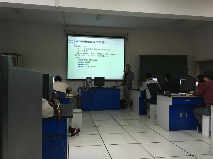 公开课内容以Verilog基本语法为基本内容展开教学,讲述了Verilog的描述、设计的三个主要部分,运算符号、关键字、规范的书写格式等内容,并进行了仿真实验,加强了动手能力的培养。杨老师讲课理论与实践结合,生动有趣,互动气氛好,学生积极听课。两节精彩的公开课后,听课的教师进行了评课,对杨老师的课给予了很高的评价。李玲香老师评价杨老师上课通俗易懂,细节处理好,纪律好。蒋恩松老师评价杨老师上课师生互动良好,善于引导,条理清晰,功底深厚,讲课中能与C语言联系很到位,能激发学生的学习兴趣。最后李玲香老师对此次公开课做了总结,并希望各位老师能从此次公开课认识到自己的不足并吸取好的地方,为以后的更好的完成教学工作而努力奋斗。