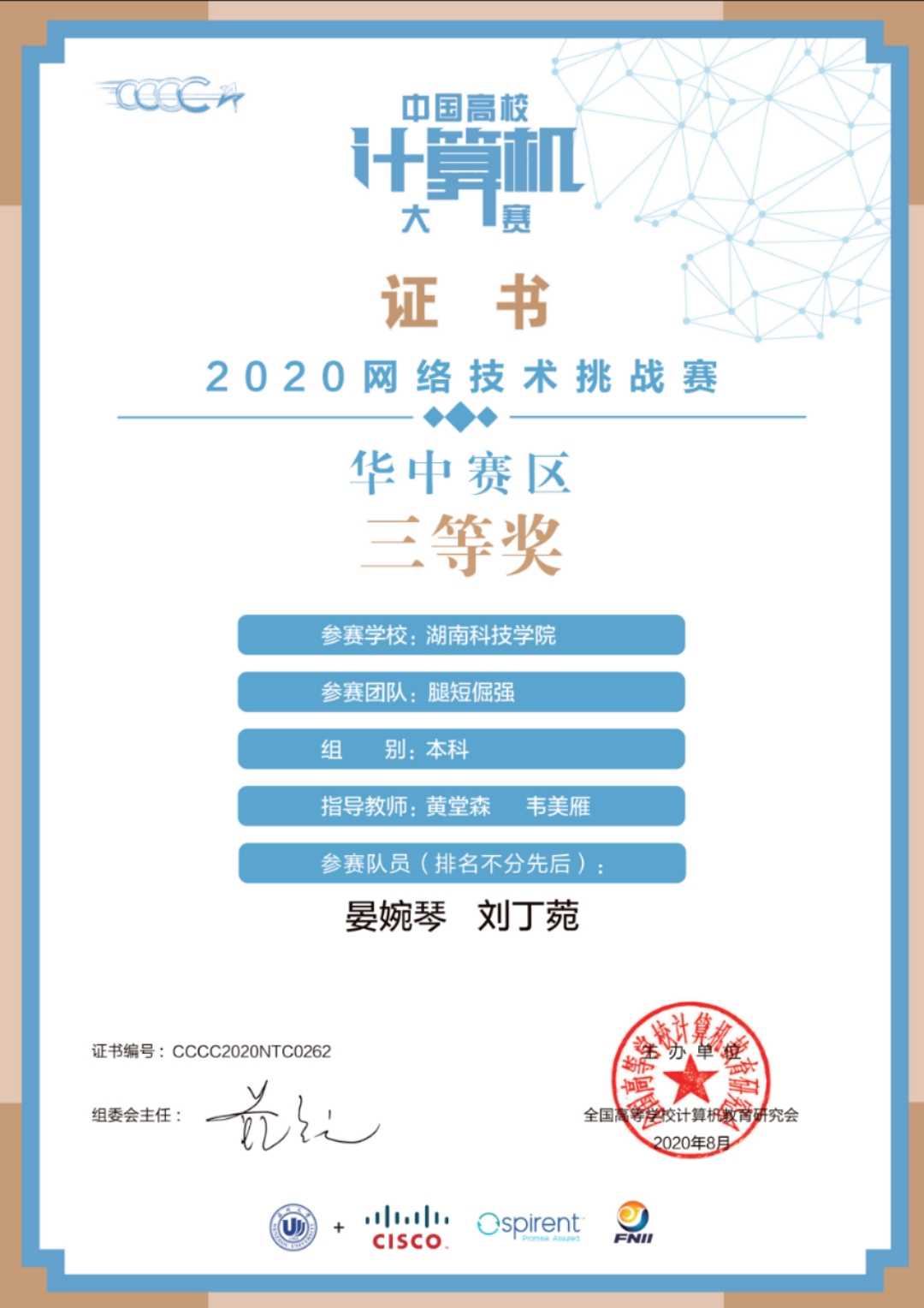 中国高校计算机大赛2020网络技术挑战赛在8月落下帷幕,由电子与信息工程学院杨杰、刘小兵、扈乐华、黄堂森、韦美艳老师带队团队分别荣获本科组三等奖三项。