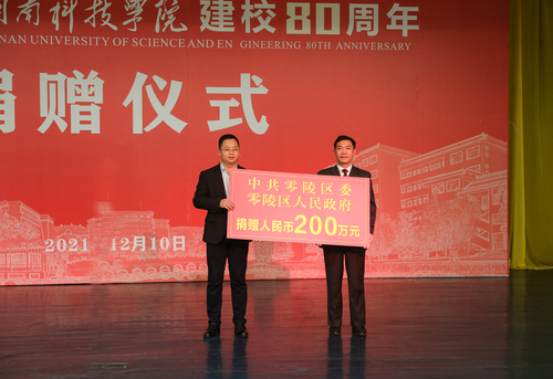 本网讯(记者 唐敏杰)12月10日下午,我校举行建校八十周年捐赠仪式,地方政府、社会组织和友好人士及校友为学校捐赠物资和现金。零陵区委副书记、区长龙亮,冷水滩区委副书记、区长李辉等地方政府代表,永州科隆房地...